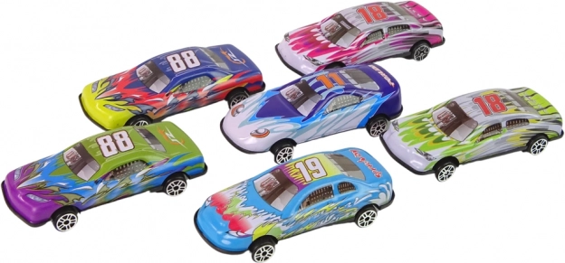 Zes kleurrijke raceauto's, elk met unieke patronen en nummers, ideaal voor racespelletjes.