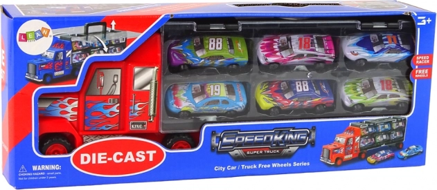 - Verpakking bevat: 1x vrachtwagen, 6x raceauto's.