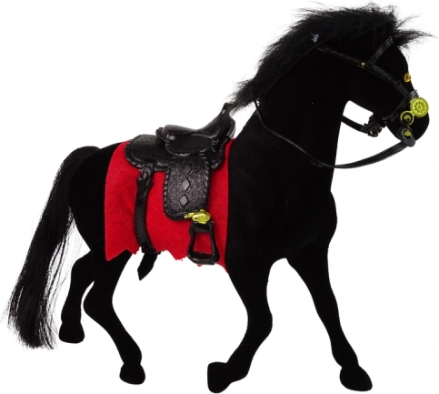 fluwelen figuur van een zwart paard met rood zadeldek en zadel