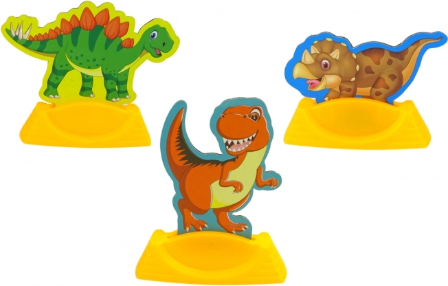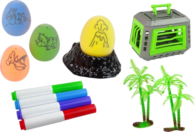 Maak je eigen dinosauruseieren – er staat een patroon op de schaal en kinderen kunnen ze naar eigen fantasie inkleuren. Twee standaards in de vorm van een vulkaan zorgen voor een stabiele presentatie.
