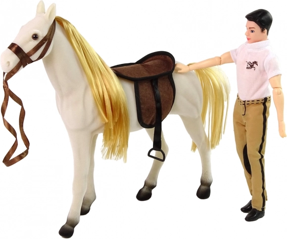 De ideale speelgoedset voor alle kleine paardenliefhebbers! Een pop met rijuitrusting en een wit paard biedt uren speelplezier en stimuleert de verbeelding en fijne motoriek van kinderen.