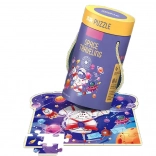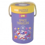 De illustraties tonen een klein astronautje in een omgeving vol planeten, raketten en satellieten, die het kind meenemen op een kleurrijk en gedetailleerd ruimtelijk avontuur. De verpakking in een handige ronde buis maakt eenvoudig meenemen en opbergen mogelijk, ideaal voor thuis en onderweg.