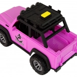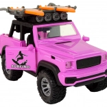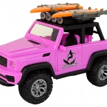 Geniet van de zomerse sfeer met deze roze offroad-wagen met surfthema. Realistische details, grote wielen en vliegwielaandrijving zorgen voor een soepele rit, terwijl lichten en geluiden elke rit tot een avontuur maken. Surfplanken en peddels op de dakdrager prikkelen de fantasie en nodigen uit tot strandverhalen.