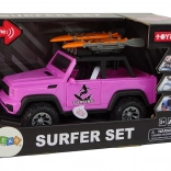 Een stijlvolle roze terreinwagen op schaal 1:14 die kleine avonturiers aanspreekt met een surf-thema. Biedt vliegwielaandrijving, licht- en geluidseffecten, openende deuren en op het dak houders voor surfplanken met peddels. De robuuste uitvoering met grote wielen is ideaal voor fantasierijk spel, zowel binnen als buiten.