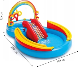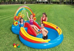 De opblaasbare waterspeeltuin van Intex combineert een ondiep bad, een glijbaan en interactieve elementen tot één kleurrijk pretcentrum. De regenboogboog met sproeier creëert een verfrissende watergordijn waarlangs kinderen veilig van de glijbaan gaan, met een zachte landingsmat onderaan. Twee waterzones met verschillende dieptes zijn ideaal voor diverse leeftijden.