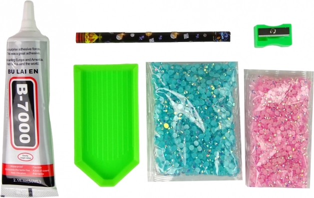 De set bevat een speciale ondergrond waarop je je decoratieve vaardigheden kunt toepassen met behulp van twee zakjes gekleurde kristallen. De speciale lijm zorgt ervoor dat de steentjes op hun plaats blijven en een schitterende versiering vormen. Versier je kamer en ontwikkel je creativiteit!