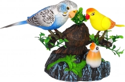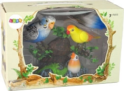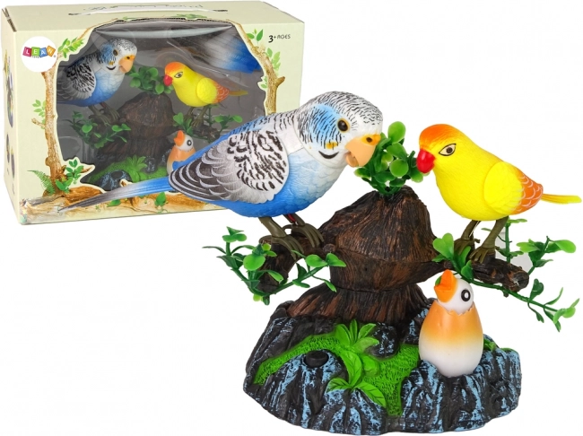 In de set vind je twee parkieten – een blauwe en een gele – geplaatst op een boomtak, en een klein kuiken in een schelp dat eronder ligt.