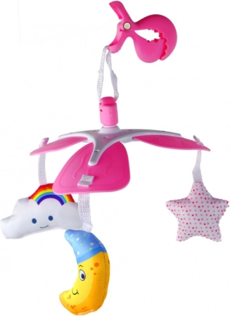 De hangende mobiel met clip is praktisch en gemakkelijk mee te nemen, waarmee u uw kind overal en altijd kunt vermaken en stimuleren. Dankzij de speciale clip kan deze eenvoudig en veilig worden bevestigd aan de rand van een kinderbedje, kinderwagen of draagdoek. De set bevat drie pluche gekleurde speeltjes - een maantje, wolkje en ster, die de aandacht van het kind trekken en hun sensorische ontwikkeling bevorderen.