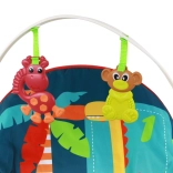 De kinder schommelstoel 2-in-1 is ideaal voor verschillende activiteiten met afmetingen van 65 cm x 50 cm x 42 cm. Het bevat een afneembare boog met schattige speelgoed van hoogwaardig plastic in combinatie met rubber, zoals een aapje en een giraf, die de zintuigen van je kind uitstekend stimuleren. Op de stof van de stoel zijn ook vrolijke dinosaurussen die het kind vermaken.