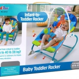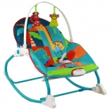 De schommelstoel heeft een verstelbare rugleuning, wat het mogelijk maakt om deze aan te passen aan de individuele behoeften van het kind. De groene en blauwe kleuren creëren een aangename en stimulerende omgeving. De stoel kan worden omgebouwd tot een stabiele stoel door de blauwe pootjes uit te klappen.
