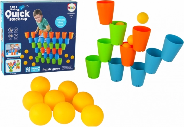Stapelkoker 3 in 1 biedt plezier voor uw kinderen. De set bevat 44 onderdelen: 12 blauwe, 12 oranje en 12 groene kelken plus 8 gele ballen voor het spelen. Ontwikkel de creativiteit en coördinatie van uw kind.