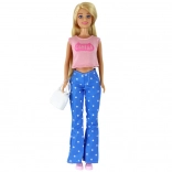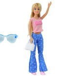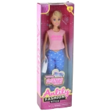 Stijlvolle pop ANLILY met lang blond haar, gekleed in een roze top, blauwe broek met sterretjes en roze sneakers. Inclusief een witte handtas en blauwe bril voor creatief stylen. Formaat van de pop 30 × 7 × 5 cm, verpakking 32 × 11 × 5 cm. Certificering CE, norm EN71, geschikt vanaf 3 jaar.