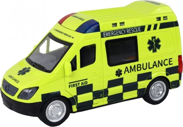 De ambulance is ontworpen om echte reddingsvoertuigen natuurgetrouw na te bootsen, inclusief gedetailleerde wielen, ramen en opschriften.