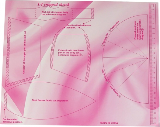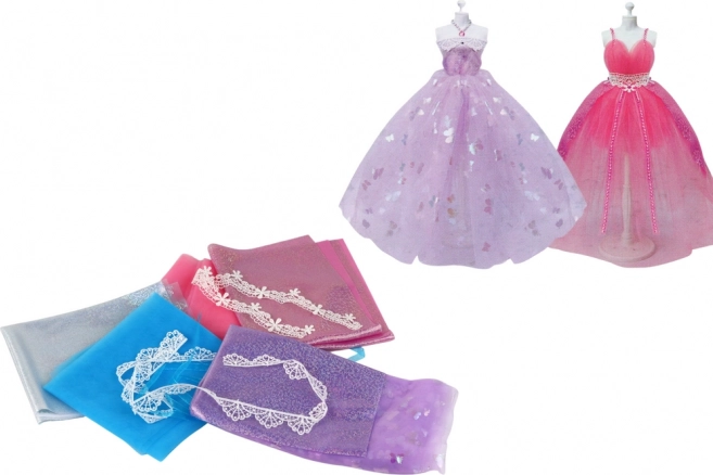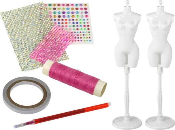 - Wat zit er in de set: 5 stoffen voor jurken, 2 jurkenstandaards, gekleurde en zilveren pailletten, lint, garen, kleurstaal, sjabloon met afmetingen en geïllustreerde handleiding.