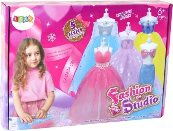 Open de deur naar de modewereld met een creatieve knutselset die kinderen de basis van design en versieren leert. Dankzij de vooraf voorbereide sjablonen met afmetingen en de praktische kleurstaal is het ontwerpen van jurken eenvoudig en leuk. De afgewerkte creaties kunnen op twee standaards worden tentoongesteld zodat elke creatie kan schitteren.