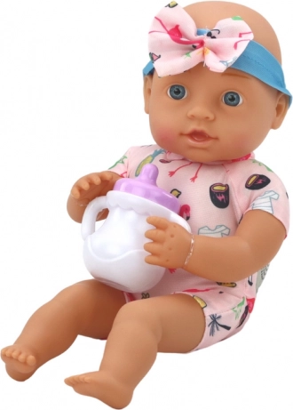 Schattige babypop in een lichtroze outfit met flamingo’s en palmen, aangevuld met een haarband met strikje. Inclusief praktische accessoires voor zorgspel: een kom met lepeltje en vorkje en een flesje. Deze pop stimuleert creatief spel, empathie en het oefenen van zorg bij kinderen vanaf 18 maanden. Inclusief CE-certificering en conformiteit met EN71.