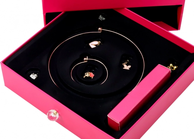 Deze royale sieradenset in een roze juwelenkistje (26 × 23 × 23 cm) zal elk kind dat graag knutselt enthousiasmeren. Bij het openen schuiven de wanden uiteen en onthullen drie grote schappen met kleurrijke schatten – van bedels in de vorm van vlindertjes, bloemetjes en sterretjes tot een ruime selectie kralen met prachtige patronen. In het midden vind je een groot hart met zorgvuldig gesorteerde mini-kralen, en onderin een uitschuiflade met gekleurde koordjes, bedels en een gouden ketting als basis voor je eigen originele sieraden.