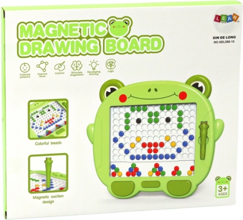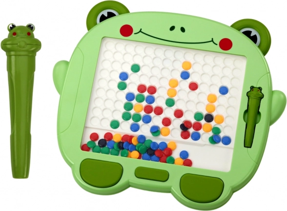 In het midden bevindt zich een groot wit bord met vakjes, perfect om magnetische kralen te rangschikken. Van deze kralen, verkrijgbaar in verschillende kleuren – zwart, blauw, geel, rood en groen – kunnen diverse patronen en afbeeldingen worden gemaakt. Door de transparante afdekplaat, die de tekening beschermt tegen toevallige beschadiging, kunnen kinderen hun composities vrij rangschikken met behulp van een speciale magnetische pen met kikkermotief.