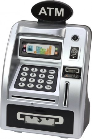 De kinderbankautomaat voor sparen is het perfecte hulpmiddel om financiële verantwoordelijkheid te leren met een vleugje interactieve fun. Gemaakt van stevig plastic in elegante zilver-zwarte kleuren, combineert deze bankautomaat een authentieke look met moderne technologie zoals een vingerafdrukscanner en geluids- en lichteffecten.