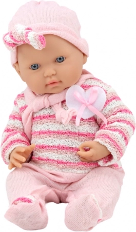 De praktische kledingset omvat een roze-wit gestreept truitje, een mutsje met strikje en een sjaal, die de pop een zachte uitstraling geven. De pop is een uitstekende keuze als eerste pop vanaf 18 maanden en voldoet aan de strenge normen CE en EN 71.