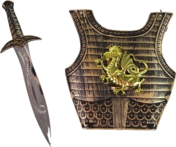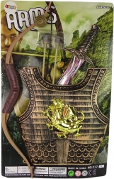 De complete set van het samuraikostuum voor kinderen bevat gouden harnas met drakenmotief, dat gemakkelijk kan worden aangepast dankzij elastische riemen. Het kostuum is uitgerust met een comfortabel zwaard met verschillende patronen op het handvat en een boog voor nauwkeurig schieten op afstand.