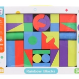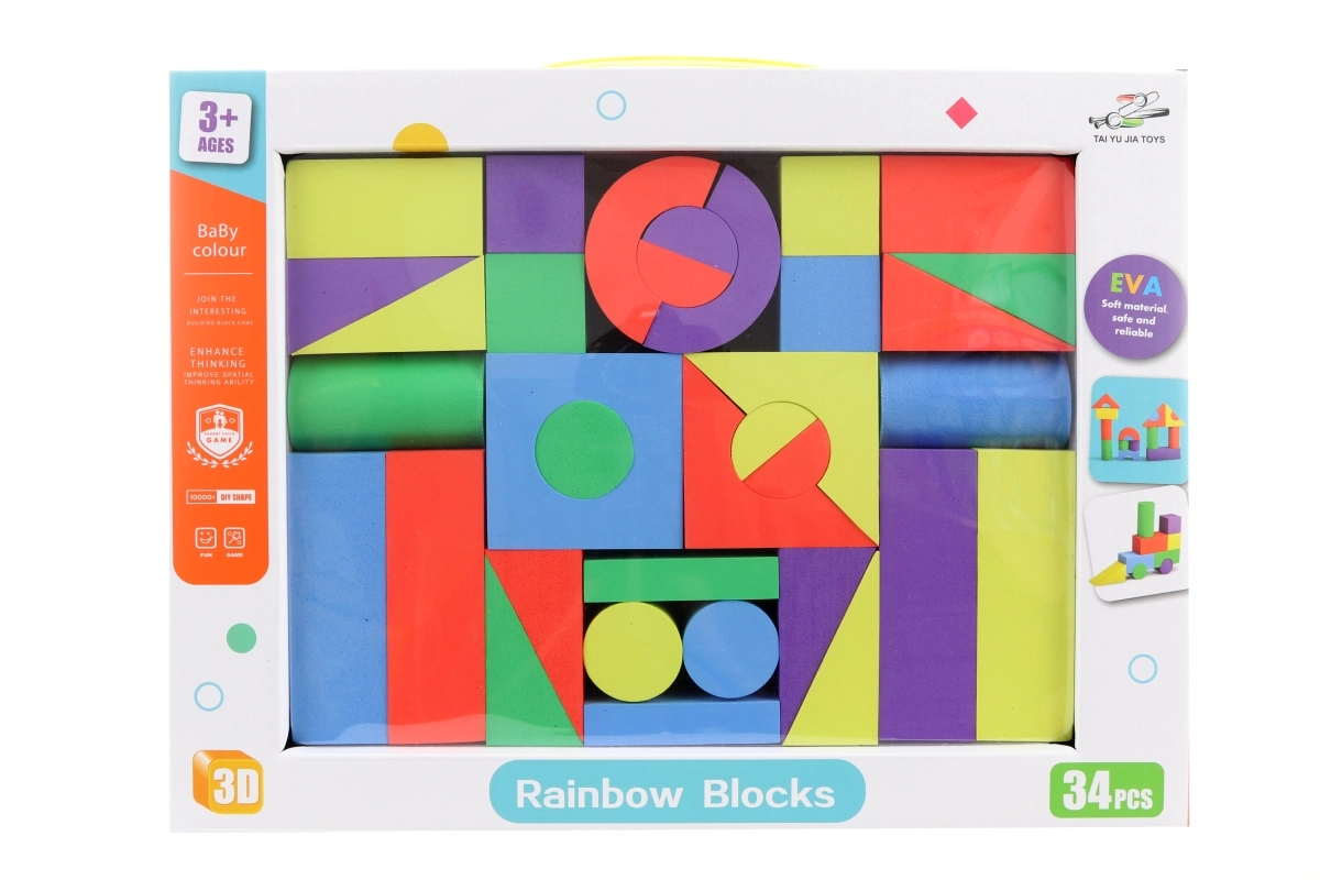 Blokken van steviger schuim in verschillende vormen en kleuren. Verpakt in een doos. Afmetingen van de verpakking ca. 37,5×26,5×4,5 cm. Leeftijd 3+