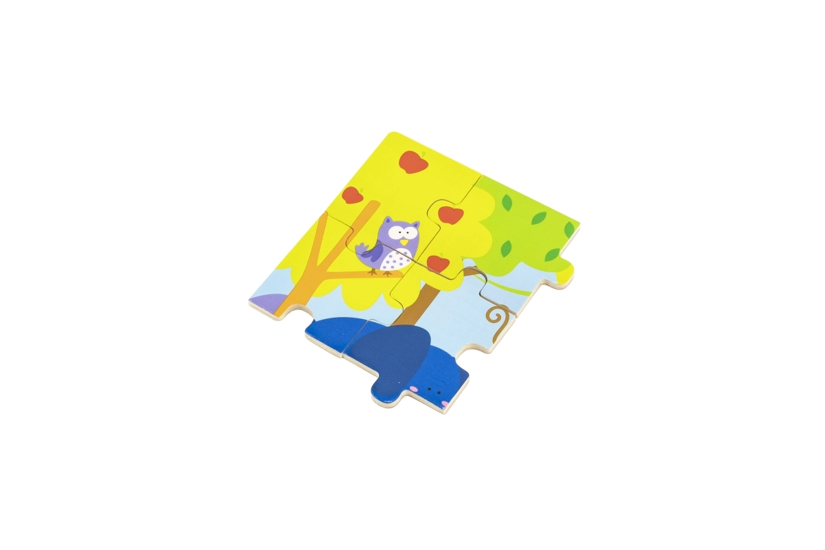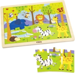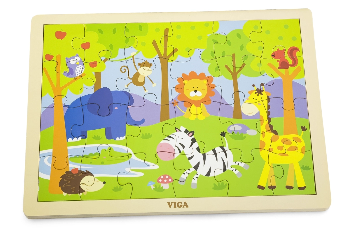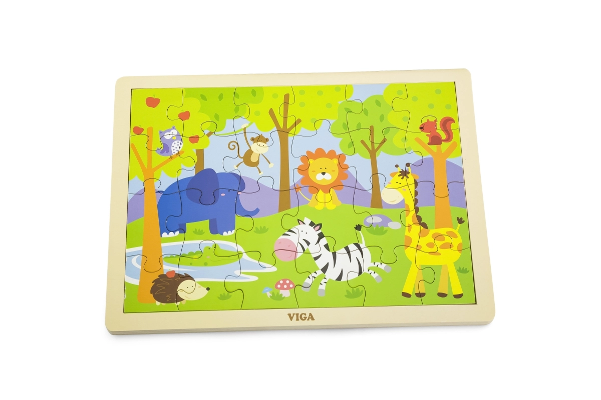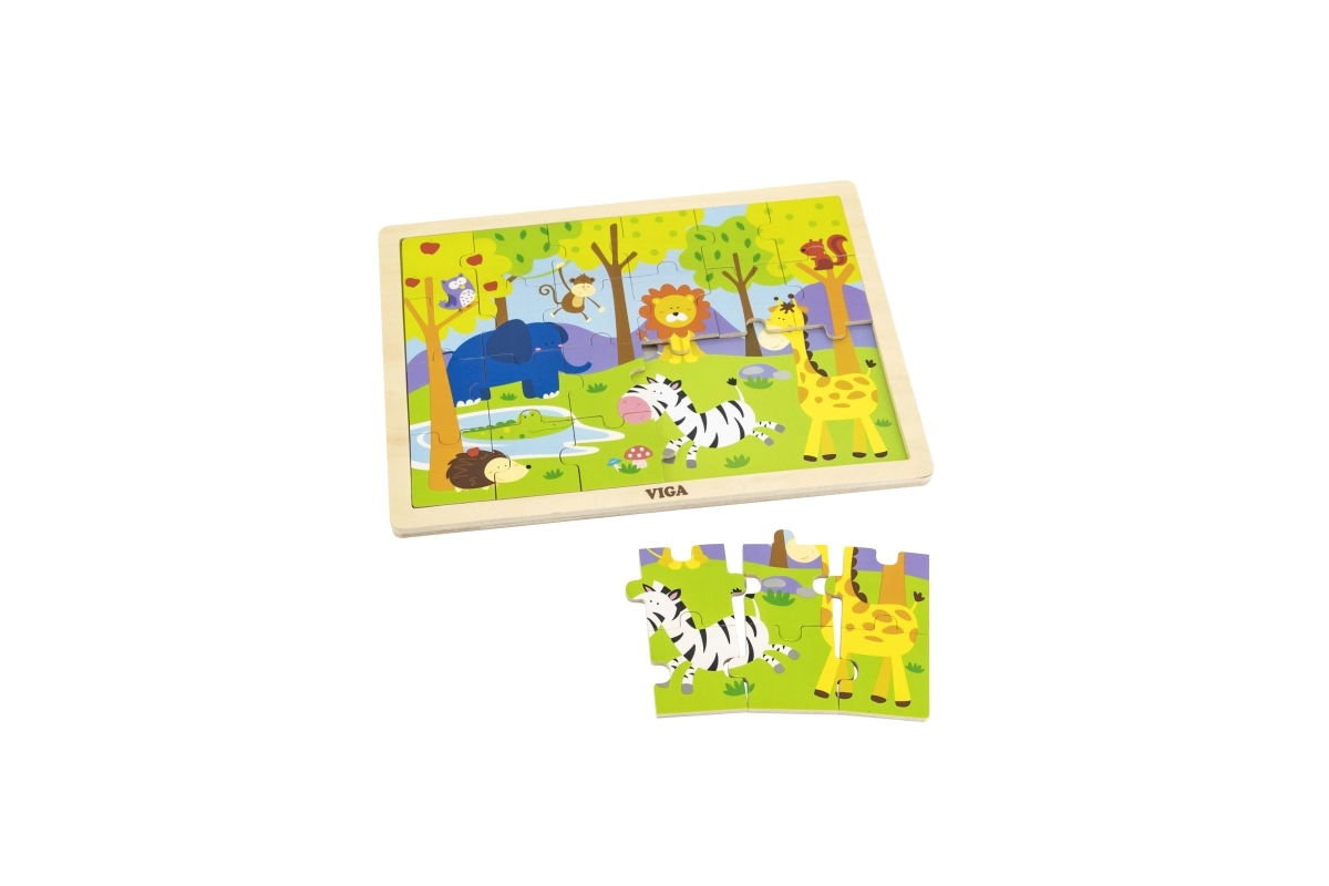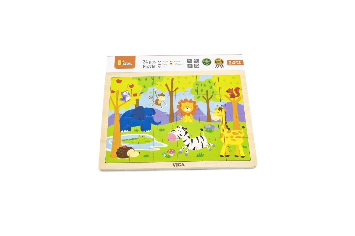 Houten puzzel met een afbeelding van de dierentuin. In totaal 24 stukjes. Afmetingen van het plaatje ca. 27,5 x 20 cm. Afmetingen van de verpakking ca. 30 x 27 x 1 cm. Leeftijd 24m+.