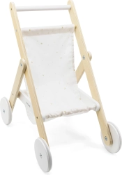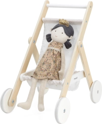 De textiele zitting met nachtelijk hemelmotief voelt prettig aan en is makkelijk te onderhouden. De praktische mand onderin biedt plaats aan kleine accessoires, flesjes of favoriet speelgoed. De wagen is ideaal voor poppen en knuffels tot ongeveer 38 cm hoog.