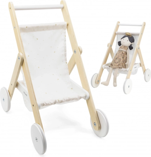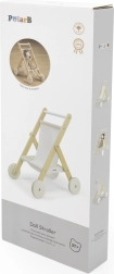 Stijlvolle houten poppenwagen uit de POLARB-lijn van VIGA die elke kleine verzorger zal verrassen. Hij heeft een stevige houten constructie, een textiele zitting met sterretjes- en maantjesprint, een opbergmandje onderin en rubberen wielen voor een stille en stabiele rit. Geschikt voor poppen tot ca. 38 cm.