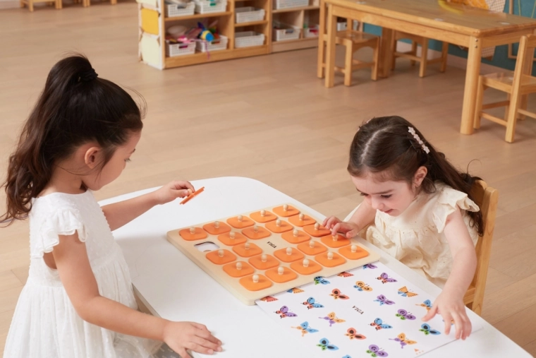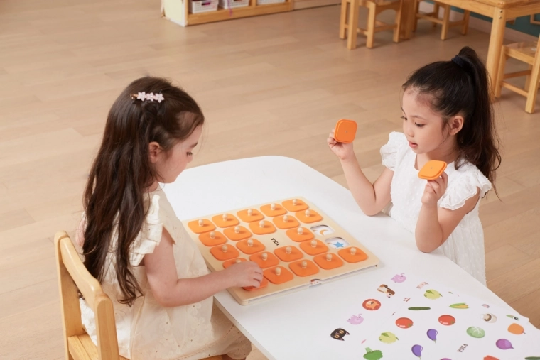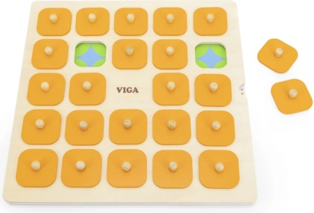 Het massieve houten bord met 25 vierkante vakjes en oranje dopjes met handgrepen is duurzaam en comfortabel voor kleine kinderhanden.