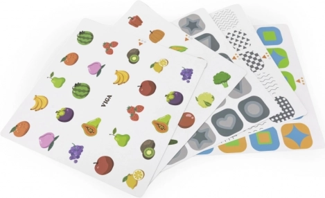 Kleurige kaarten met motieven van vormen, fruit en dieren maken het mogelijk de moeilijkheidsgraad aan te passen en kinderen te leren herkennen en sorteren.