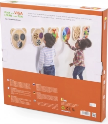 Schattig wandpaneel in de vorm van een beer met kleurrijke tandwielen en windmolentjes van VIGA ontwikkelt kinderhandigheid en denken. Draai aan één wiel en kijk hoe alle andere gaan draaien – kinderen trainen op natuurlijke wijze hun logisch denken, hand-oogcoördinatie en kleuren leren. Hoogwaardig hout met niet-giftige verf en FSC-certificering garandeert veilig en zinvol spel vanaf 18 maanden.