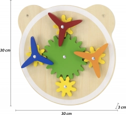 Het houten paneel in de vorm van een berenkop combineert vijf gekoppelde tandwielen en drie windmolentjes. Spelenderwijs leren kinderen het principe van oorzaak en gevolg: na het draaien aan één wiel komen alle in beweging. Zo trainen ze op natuurlijke wijze fijne motoriek, visuele waarneming en teamwerk wanneer ze elkaar afwisselen bij één paneel.