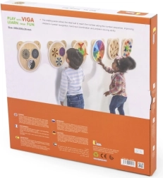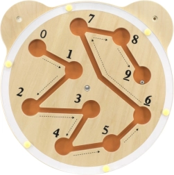 Dit educatieve wandpaneel van Viga in de vorm van een schattige berenkop combineert plezier en leren. Met de draaiplaat leid je de stalen knikker door de groeven zodat hij stap voor stap elk cijfer van 0 tot 9 bereikt. Kinderen oefenen spelenderwijs tellen, geduld en probleemoplossend vermogen.