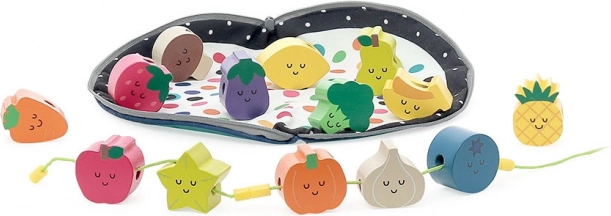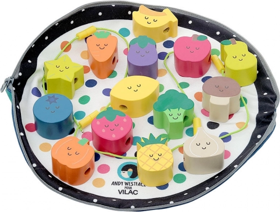 Kreatief speelgoed voor kinderen, dat de fijne motoriek en hand-oogcoördinatie ontwikkelt dankzij grote houten kralen met motieven van fruit en groenten.