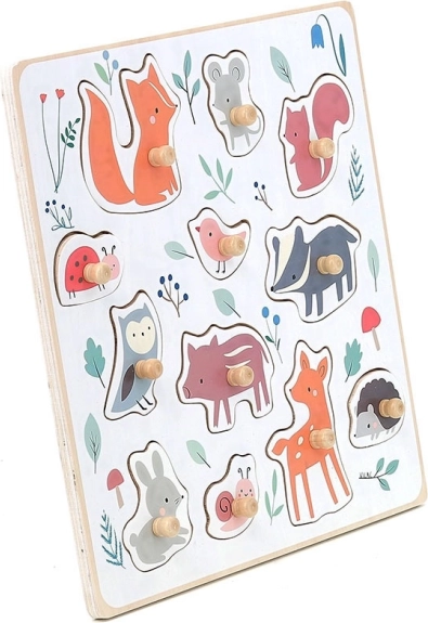 - 12 houten puzzelstukjes met knopjes: vos, muis, eekhoorn, lieveheersbeestje, vogeltje, das, uil, biggetje, haas, slak, ree, egel