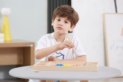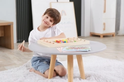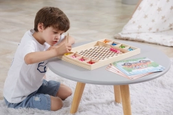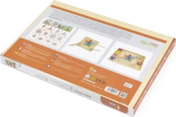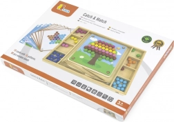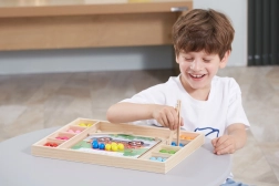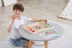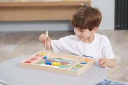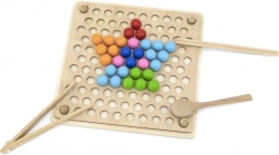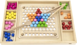 Het houten educatieve spel "Pak en Sorteer" laat kinderen verschillende patronen en kleuren uitproberen volgens de meegeleverde kaarten of hun eigen fantasie. Met dit spel kunnen kinderen het papier op het houten dienblad bevestigen en met behulp van stokjes, een lepel of een klem gekleurde balletjes in de gaten van het bord plaatsen. Zo kunnen ze uiteindelijk prachtige afbeeldingen maken.