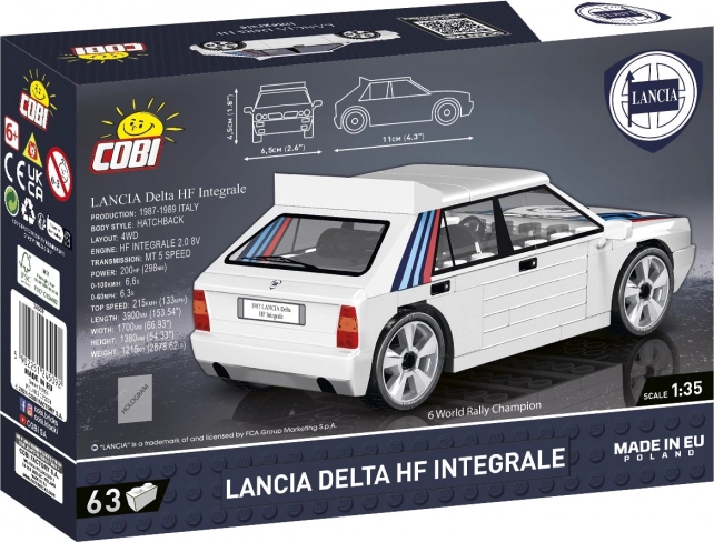 Gelicenseerde bouwset van de legendarische sportwagen LANCIA Delta HF Integrale op schaal 1:35 biedt 63 onderdelen, draaibare wielen en hoogwaardige prints. Eenvoudige bouw, een geweldige uitstraling en compatibiliteit met andere merken maken het tot een perfect verzamelmodel voor autoliefhebbers van alle leeftijden.