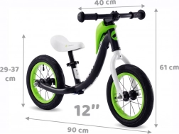 Dankzij de 12" luchtbanden rolt de loopfiets soepel, ook op minder vlakke ondergrond. De snelle zadelverstelling (ca. 31–38 cm) laat je de hoogte aanpassen aan de groei van je kind. De praktische draagriem is ideaal tijdens uitstapjes en na het spelen.
