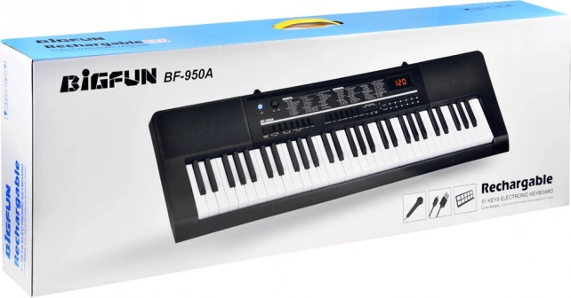 Elektronisch keyboard BF-950A met 61 toetsen is een ideale keuze voor beginnende muzikanten en kinderen. Het biedt 200 klanken, 200 ritmes, 70 demo-nummers, opname en weergave, ingebouwde stereo luidsprekers en een oplaadbare batterij om zonder stopcontact te spelen. Inclusief microfoon, bladhouder en display voor eenvoudige bediening.