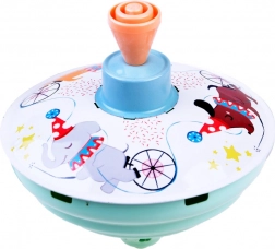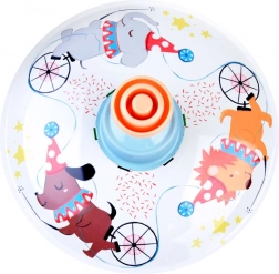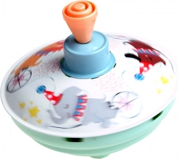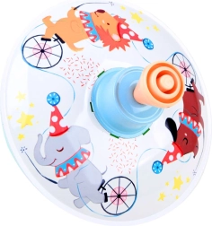 Het speeloppervlak is versierd met speelse dierillustraties met een circusthema, die de fantasie en het visuele waarnemen stimuleren. De metalen body in combinatie met een kunststof handgreep zorgt voor duurzaamheid, ook bij dagelijks gebruik. De tol is ideaal voor de ontwikkeling van fijne motoriek, oog-handcoördinatie en geduld.