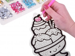 Creëer sprankelende afbeeldingen en stickers met snoepthema met behulp van grotere “diamanten” die gemakkelijk met de applicator kunnen worden opgepakt en precies op de zelfklevende sjablonen worden geplaatst. Kinderen oefenen spelenderwijs de oog-handcoördinatie, concentratie en esthetisch gevoel – met als resultaat prachtige decoraties voor raam, spiegel, schrift of plank.