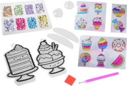 Maak glinsterende stickers en hangornamenten (bijv. voor het raam) dankzij 2 grote sjablonen, zuignappen met haakjes en 12 leuke dessertmotieven.