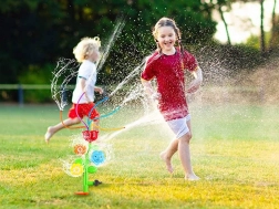 Geniet van eindeloos plezier met deze kleurrijke kindersproeier die water in alle richtingen verspreidt. Tijdens het spuiten draaien de bloemen vrolijk en de kleuren mengen zich prachtig, wat nog meer speelsheid en vreugde stimuleert.