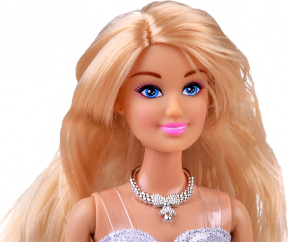 De pop draagt een elegante zilveren rok en een prachtige halsketting, wat haar modieuze uitstraling benadrukt.