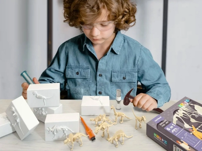 Kruip in de huid van een echte paleontoloog en ontdek de botten van dinosaurussen die duizenden jaren geleden op aarde leefden. Elke gipssteen bevat het skelet van legendarische soorten – van de geliefde Tyrannosaurus tot de majestueuze Brachiosaurus. Tijdens het opgraven oefenen kinderen geduld en nauwkeurigheid, en bij het in elkaar zetten van het skelet logica en verbeeldingskracht.