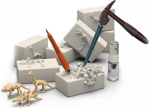 De set is ideaal als creatief en educatief cadeau voor nieuwsgierige kinderen. De werkwijze is eenvoudig: bevochtigen, voorzichtig met beitel en hamertje blootleggen, stof wegvegen met de kwast en tot slot het skelet monteren. Het resultaat is een kleine thuiskollectie van zes dinosaurusmodellen.