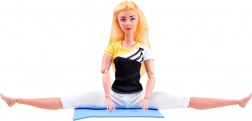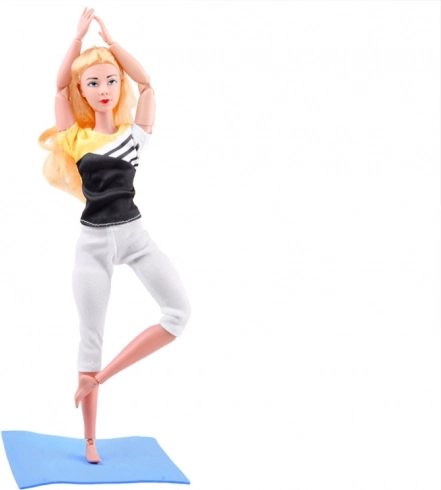 De flexibele pop met lang blond haar draagt een sportset met elastische legging en top, zodat ze comfortabel kan trainen. De gewrichtsconstructie maakt realistische posities van armen, benen en romp mogelijk, waardoor favoriete asana’s en gymnastiekhoudingen eenvoudig kunnen worden nagebootst.