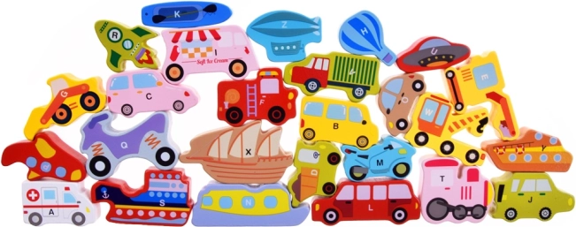 Deze houten set bevat 27 kleurrijke voertuigen – van auto, bus en brandweerwagen tot ballon, schip, raket en luchtschip – en een houten basis met gemarkeerde namen. Elk stukje draagt een letter A–Z (inclusief een speciaal motief), wat kinderen helpt het alfabet op een speelse manier te leren en hun woordenschat uit te breiden.