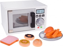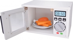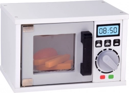 De houten magnetron is de perfecte aanvulling voor de kinderkeuken. Gemaakt van hoogwaardig hout, beschikt het over een plastic draaiknop die een rammelend geluid maakt bij het draaien. De magnetron heeft een realistisch ontwerp met witte kleur en grijs-zwarte details.